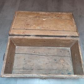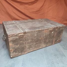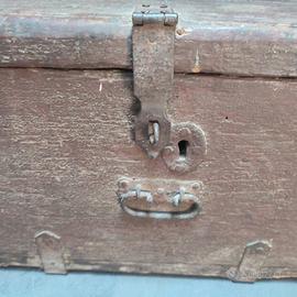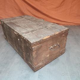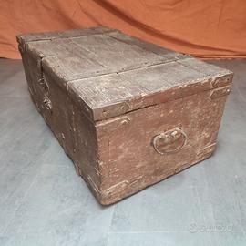 Vecchio baule in legno colore marrone con rinforzi in metallo, dimensioni cm 75 x 40, altezza cm 30. No spedizione, solo ritiro a mano
