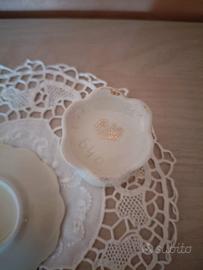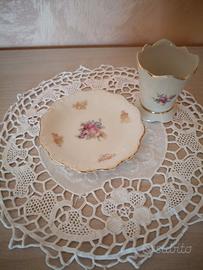 Vecchio bicchierino e piattino in ceramica con disegni floreali e filettatura dorata marchiati "Bavaria".