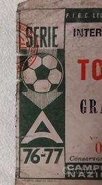 Vecchio tagliando / ticket / biglietto d'entrata per la partita di calcio "Internazionale Milano - Torino", campionato 76/77. Il fortissimo Torino di Gigi Radice ,reduce dalla vittoria del campionato "75/76", con gli indimenticabili Pulici, Ciccio Graziani, Sala, Zaccarelli, Pecci ,Caporale ,Castellini ,ecc., affronta l'Inter di Mazzola, Facchetti, Oriali, Bordon, Marini, Anastasi (appena arrivato dalla Juventus dopo un clamoroso scambio con Boninsegna). Il biglietto non è in perfette condizioni ma si presenta comunque bene. Un pezzetto di storia di 2 grandi squadre.