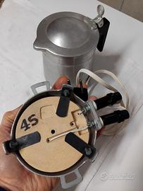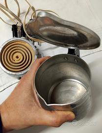 vecchio bricco / cuccuma / contenitore in alluminio (99%) con manico in materiale plastico nero e un fornello/ fornelletto "IMEC 100" (non testato), molto belli ed in buone condizioni.