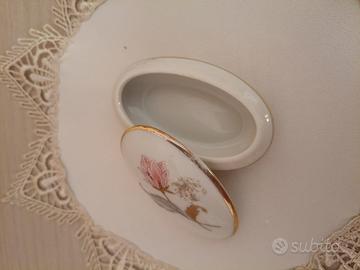 Vecchio cofanetto ovale in ceramica marchiato "Limoges" e firmato, con filettatura dorata.