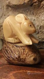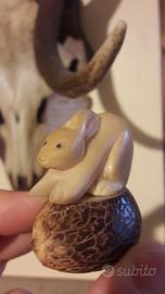 Bellissimo piccolo coniglio / lepre in corno "intagliato". Il coniglietto misura cm.4,6 (dalla zampina alla coda) ed è alto circa cm. 2,8 (h.cm. 4,6 compresa la base). Davvero grazioso e particolare, sicuramente non comune, bello anche come idea regalo .