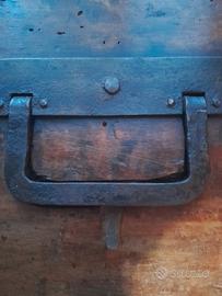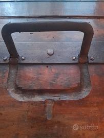 vecchio forziere in legno di noce con bordi rinforzati e chiusura in ferro .lateralmente ha due maniglie in ferro a scomparsa.lunghezza cm70 altezza cm 40 profondità cm 40