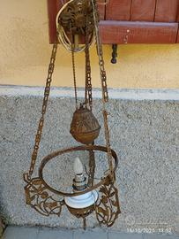 vecchio lampadario in ferro lavorato a mano , con contrappeso centrale di circa 2 kg. funzionante . Altezza 40 cm , diametro 25