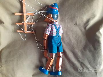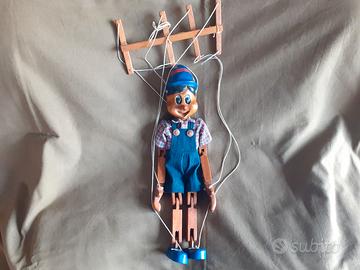 Antico burattino Pinocchio di Collodi in legno laccato, intagliato, scolpito. Con 8 fili.