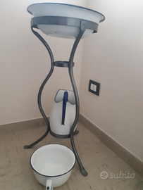Vendo vecchio porta catino con relativa brocca per l'acqua e vaso da notte.... la struttura è in ferro battuto ed è alta cm 75 con un diametro di cm 40 ..... i tre accessori in metallo smaltato bianco con finitura blu sulla parte superiore, sono tutti marchiati Due Leoni e presentano poche ossidazioni nonostante gli anni passati inutilizzati... di bel aspetto e in buone condizioni... Non spedisco ma posso consegnare zona Cento, Ferrara, Occhiobello e Rovigo