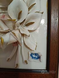 Vecchio quadro in ceramica marchiato Capodimonte rappresentante mazzo di fiori con cornice in legno.