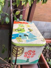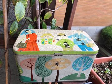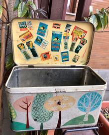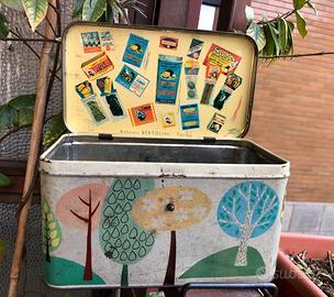 Vecchissimo Bauletto Lievito Bertolini con illustrazioni di viaggiatori e fotografi . Ben conservato compatibilmente con i suoi 80 anni circa