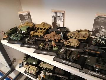 Mezzi militari (ca. 1/43) e fascicoli (con illustrazioni, foto, storia e descrizione tecnica), collezione completa DeAgostini primi anni 2000 (40 pezzi). Si tratta di veicoli leggeri da ricognizione, da trasporto e blindati da artiglieria dagli anni 20 agli anni 90 del XX secolo. Veicoli americani e inglesi (Jeep Willis, Dodge etc.), tedeschi, russi, francesi e italiani. Ottime condizioni.