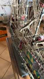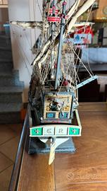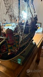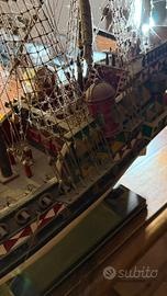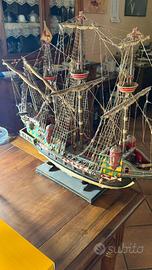 Vendo modellino di nave antica in legno realizzato artigianalmente, ricco di dettagli e completo di supporto base. Oggetto decorativo ideale per studio, taverna o collezionisti di modellismo navale. Lunghezza circa 70 cm. Buone condizioni generali. Disponibile Ritiro a mano.