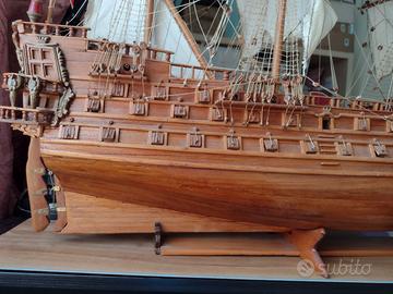 splendido veliero realizzato tutto a mano negli anni '70, no kit di assemblaggio ma anche i particolari in ottone e i cannoni sono stati realizzati con appositi stampi. la base è rimovibile. e' rimasto in soffitta per oltre 15 anni. non spedisco. ingombro max 87x87, prof. 43.