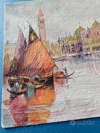 Rara e originale cartolina che simula un dipinto ad olio, quindi appare a rilievo (ho cercato di mostrarlo fotografando con la luce radente).
