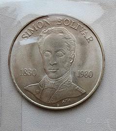 Moneta in argento dedicata al 150° anniversario della scomparsa di Simón Bolívar, sul dritto il busto del libertador con la legenda “SIMON BOLÍVAR” sopra, “1830-1980” su entrambi i lati e “AITA” sotto. Sul retro è visibile il mausoleo di Simón Bolívar situato nel Pantheon Nazionale di Caracas. In alto, la legenda “REPÚBLICA DE VENEZUELA” e in basso “1980” e “100 BOLÍVARES”. PESO: 22 gr DIAMETRO: 40 mm. TITOLO ARGENTO: 900% CONSEGNA A MANO A MILANO CITTA' (centro), SPEDIZIONE IN TUTTA ITALIA.