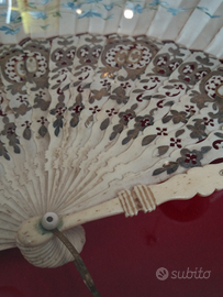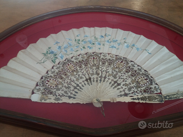 Ventaglio antico in seta e osso risalente al XIX secolo dipinto a mano e montato su cornice con vetro.