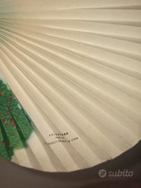Ventaglio circolare vintage, in carta di riso cinese, con decori con casa tipica, e vegetazione, con manico in metallo nero.