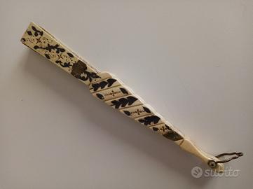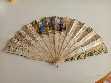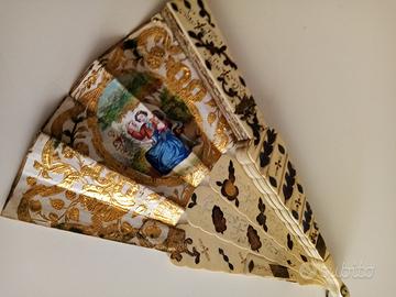 Bellissimo ventaglio francese in osso e carta litografata con fregi in oro su entrambi le facce. Le stecche sono intagliate e decorate in oro. Aperto misura cm 52. Ha avuto alcuni interventi di restauro conservativo.