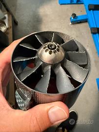 L'alloggiamento della ventola, realizzato in fibra di carbonio unidirezionale, è incollato allo statore in alluminio. L'alloggiamento è molto rigido e consente di realizzare un gioco minimo in punta. Questo si traduce in una maggiore spinta statica quando la ventola è installata nel modello.