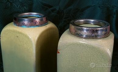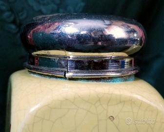 VERBANUM STONE S.C.I. LAVENO BARATTOLI DA CUCINA TERRAGLIA FORTE POST 1940 RARI - SPEDIZIONE GRATIS IN TUTTA ITALIA - LEGGERE ATTENTAMENTE E CONTROLLARE L'INTERA GALLERIA FOTOGRAFICA - VECCHIO SET DA TAVOLA COMPOSTO DA DUE AMPOLLE CAFFÈ E ZUCCHERO IN TERRAGLIA FORTE VERBANUM STONE CON TAPPI IN METALLO NICHELATO CHE SI INNESTANO A DUE CORONE SEMPRE DELLO STESSO MATERIALE - PRODOTTI DALLA SOCIETÀ CERAMICA ITALIANA DI FRANCO REVELLI SOTTO LA DIREZIONE ARTISTICA DI GUIDO ANDLOVIZ A PARTIRE DAGLI ANNI '40 GRAZIE ALL'ESTRO ARTISTICO DI ANTONIA CAMPI CHE HA LASCIATO LA COLORAZIONE NATURALE DELLA LAVENITE SENZA LA CLASSICA SMALTATURA BIANCA - DECORO DIPINTO A MANO (NON A DECALCOMANIA) SOTTO-SMALTO DI COTTURA CON COLORI NON CONSUNTI DAL TEMPO - PEZZI BEN CONSERVATI CONSERVATI SENZA CREPE CON CRACKLÈ SPARSO SULLE SUPERFICI - LE PARTI METALLICHE PRESENTANO FIORITURE E PUNTINATURE DI OSSIDO MA ANCORA MOLTO RIFLETTENTI CON UNA LIEVE CREPA SULL'INNESTO DI UN TAPPO EVIDENZIATA IN FOTO - DIMENSIONI RIPORTATE IN GALLERIA FOTOGRAFICA