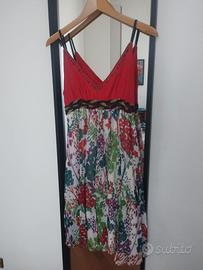Vendo vestito vestitino estivo brand Uttam London made in India taglia L. L'abito ha fantasia floreale nei colori rosso, verde, bianco.. Applicazione di perline sul decolté e gonna molto ampia e leggera. Spalline sottili e regolabili. Lunghezza media.