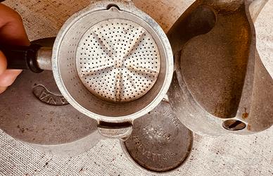 La Vesuviana in alluminio e bachelite brevettata Cesare Bialetti anni '50 (brev. 415468) O.M.G. Officine Meccaniche Gozzano, in buone condizioni, progettata per essere posizionata sopra i fornelli. Il corpo principale di questa caffettiera è realizzato in fusione di alluminio, mentre i manici sono in bachelite.