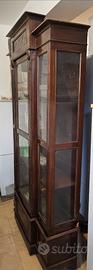Vetrina liberty in legno di noce con decori scolpiti a motivi floreali e parte inferiore con 3 cassetti; parte superiore a vetri. In ottime condizioni con vetri integri e legno con patina originale. Origine Sicilia di fine ‘800 primi ‘900 Misure: 125x35x H230 cm.