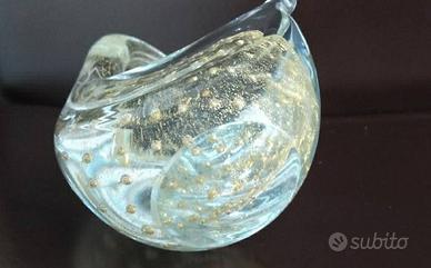 Dalla forma sinuosa ed elegante con tecnica a bolle controllate, lavorato a caldo in vetro cristallo purissimo con foglia oro.