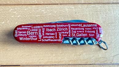 il coltello ha guancette speciali con la parola Svizzera incisa su di esse in 20 lingue su un lato, e i nomi delle più grandi città e capitali cantonali del paese, così come molti altri luoghi significativi, sul retro.