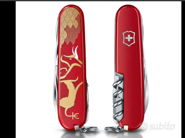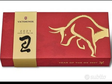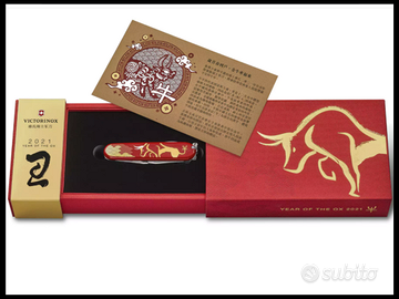 Coltellino svizzero Victorinox Huntsman in edizione speciale per l'Anno del Bue 2021. Con l’Huntsman 2021 in edizione limitata "Anno del Bue", la precisione svizzera incontra lo zodiaco cinese. Ogni anno Victorinox lancia un nuovo coltello tascabile Huntsman per celebrare il Capodanno cinese e onorare il segno zodiacale del momento. Il 2021 era l'anno del bue, simbolo di affidabilità, determinazione e onestà. Questo oggetto era destinato a rendere il 2021 un anno di successo e realizzazione. Disegno dinamico di un bue dorato dalle possenti corna bianche. Limitata a 8.000 esemplari in tutto il mondo, richiama il numero fortunato 8
