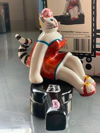 Vestito con un vivace abito rosso, con giocosi elementi a tema viaggio che richiamano Roma e New York, questo gatto stilizzato, seduto su una custodia per violino, trasuda personalità e fascino.