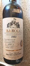 Bottiglia di Barolo del 1982 proveniente dalla casa vinicola Bruno Giacosa di Neive (Piemonte). La bottiglia è intatta e integra in ogni parte, è stata conservata in cantina in posizione sdraiata. Vista e piaciuta.