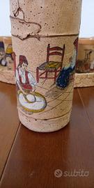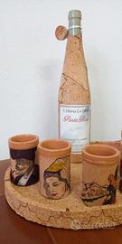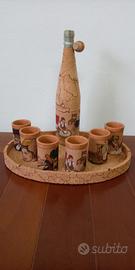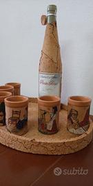 Bottiglia di vino Cannonau da collezionismo (anni '70), foderata in sughero decorato, con 6 bicchieri in ceramica anch'essi rivestiti in sughero decorato. Vassoio interamente in sughero di dimensioni 37 cm x 27 cm x 3 cm. Bottiglia di altezza 34 cm, diametro 7,5 cm.