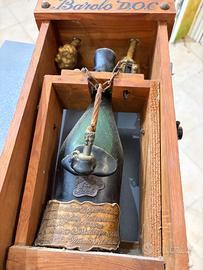 Espositore "Versadoc": La struttura in legno è un versatore a culla (o tipper) d'epoca, progettato per permettere di versare il vino senza scuotere la bottiglia, evitando così di sollevare eventuali sedimenti tipici dei vini invecchiati.