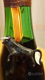 Bottiglia di Sangre de Toro "seco" della rinomata cantina spagnola Miguel Torres annata 1988. Pezzo di storia dell'enologia catalana (Penedes), completa dei suoi elementi distintivi originali dell'epoca. Vitigni Garnacha e Carinena, gradazione 13% vol. presente il caratteristico toro in plastica nera attaccato al collo della bottiglia con nastro con i colori della Catalogna, simbolo storico del marchio di fabbrica creato da Miguel Torres nel 1954, etichetta posteriore in italiano (importazione storica Boldrini Import Export - Roma) con dettagli e maturazione. La bottiglia è stata conservata in ambiente idoneo, la capsula è integra e perfettamente sigillata, le etichette sono originali e ben leggibili, con i normali segni del tempo. Trattandosi di un vino di annata con quasi 40 anni di storia la bottiglia viene venduta come oggetto da collezione, non è possibile garantire la bevibilita del contenuto.