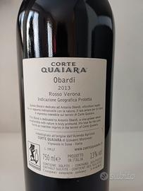 Vendo bottiglia di vino rosso Verona. Cantina: Corte Quaiara Bottiglia: Obardi 2013 Conservazione a temperatura controllata in cantinetta a 16 gradi. Valore effettivo 80€ vendo a 50€