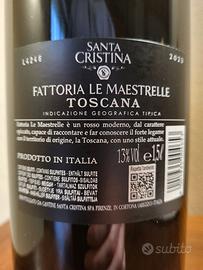 La Fattoria Le Maestrelle, rosso toscano prodotto da Santa Cristina (Antinori), unisce uvaggi di Sangiovese, Merlot e Syrah. Note di frutti rossi e spezie, equilibrato e perfetto con piatti italiani tradizionali.