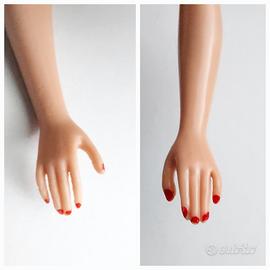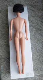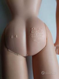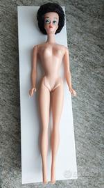 NON SPEDISCO - Vintage 1961 JET BLACK BUBBLECUT BARBIE, tutto originale con costume a righe bianco e nero. No green ears, hair style originale, ombretto sugli occhi e smalto sulle unghie. Scritta sul posteriore "Barbie (r) Pats Pend (c) MCMLVIII by Mattel Inc." Scritta JAPAN sul piede destro. Compreso l'originale piedistallo di metallo nero