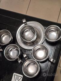 Servizio da caffè composto da 6 tazzine termiche con rispettivi piattini realizzati in acciaio inox 18/10, manifattura degli anni '70, prodotto da "La Termica - Jolly - Rivadossi". Ottime condizioni.