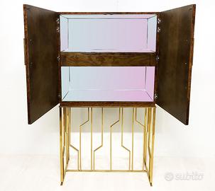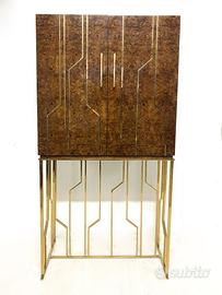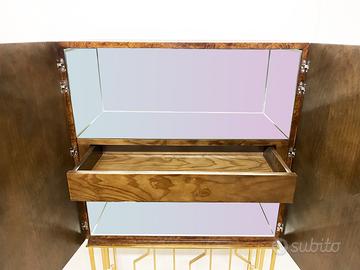 Particolare Mobile Bar anni'70 interamente in radica di mogano con inserti e gambe in ottone, interni a specchio e piccolo cassetto interno.