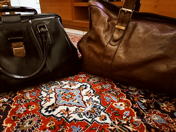 Vintage anni 50 vera pelle. Bauletto donna in ottime condizioni (piccoli segni del tempo) color nero. Borsone uomo da viaggio in vera pelle Sem Vaccaro Garrett color cuoio in condizioni perfette. Due manici, zip. Vendo singolarmente o in blocco.