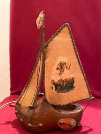 Vintage anni 50 Lampada a forma di veliero su base zoccolo olandese di legno - vele in pelle con contorno di passamaneria - lampada funzionante - sullo zoccolo e’ presente la scritta The Flying Dutchman - il disegno sulla vela e la bandiera sull’albero sono un po’ rovinati