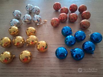 Palline di Natale vintage effetto discoteca. 7 blu, 8 gialle, 6 grige, 9 rosse con brillantini dorati.