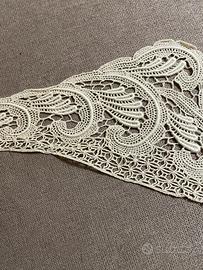 Un colletto vintage in merletto guipure, proveniente dalla mia famiglia a Trieste e conservato con grande cura. È un dettaglio elegante, ideale per completare abiti, camicette o per progetti sartoriali creativi. La lavorazione è fine e luminosa, con un disegno classico a volute molto decorativo. È stato usato poco ed è ben conservato.