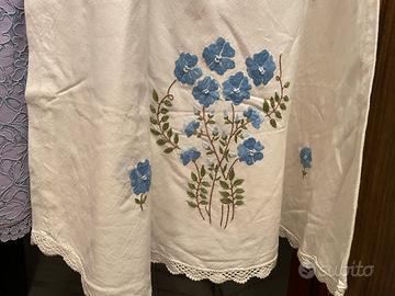 ricoperti di pizzo; camicia da notte (si presta anche come abitino estivo) di lino grezzo color panna ricamato con mazzo di fiori azzurri centrale sul davanti e fiorellini sparsi, sempre azzurri - l'orlo e profilato con pizzo a uncinetto (color panna) mai usati