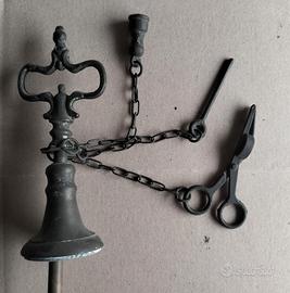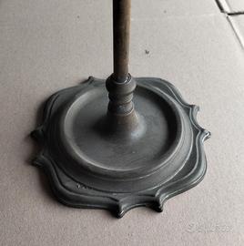 vendo lampada ad olio denominata "fiorentina" a tre fiamme in ottone brunito. Trattasi di antica manifattura toscana ricavata per fusione in buone condizioni, si compone di basamento con forma vagamente quadrata da cui centralmente di sviluppa un'asta sulla quale scorre una sorta di una coppa -per l'olio combustibile- con tre beccucci e coperchio conico a chiusura. Al termine dell'asta è presente l'impugnatura -ricamata- per il trasporto. Tre catenelle sul coperchio conico della coppa trattengono l'attrezzatura per la gestione della fiamma, lo spegni fiamma, le forbici taglia stoppino e il perno pulisci foro. La lampada ha un basanebto di 15x15 cm, è alta circa 50cm e pesa approssimativamente 2kg. Necessita di pulizia della patina di ossido tipica dell'ottone. Sto liberando spazio, invito ad osserbare altri miei annunci.