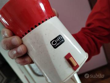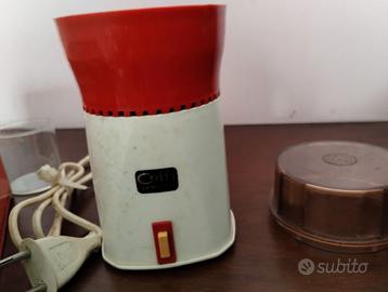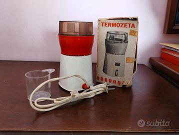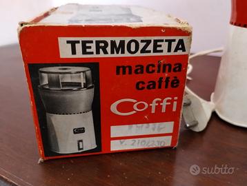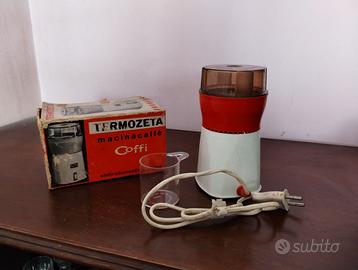 Collezione macinacaffè elettrico vintage del marchio italiano Termozeta. Vecchio modello "Coffi" con l'interruttore davanti. Struttura in plastica bianca e rossa con coperchio trasparente, incluso di scatola originale. La scatola è in parte rotta lateralmente ma si chiude bene. Macinacaffè: la parte in rosso contiene la vaschetta per i chicchi di caffè e la lama rotante (a due pale in acciaio inox) con coperchio e misurino. La parte in bianco contiene il motore.La lunga serie di finestrelle quadrate alla base del settore rosso serve solo per l'aereazione del motore elettrico. Come indicato sulla base, funziona a 210/230V e ha una potenza di circa 150W - 180W (anche se la sigla V210/230 si riferisce principalmente alla tensione). Vendita finale. Contattare solo se veramente interessati. Disponibile anche consegna a mano a: Torino, Vercelli e Novara