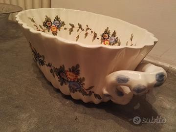 Vendo grande Ciotola Centrotavola Decorativa in ceramica Capuani Este, dipinta a mano, con manici zoomorfi stilizzati e bordo ondulato. Produzione artigianale italiana del secondo Novecento, marchio originale presente. Elegante pezzo da tavola o arredo, autentico vintage da collezione.