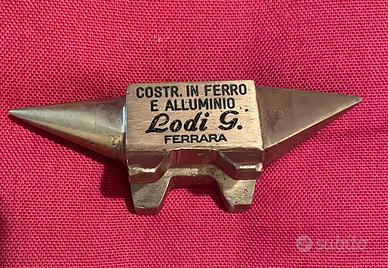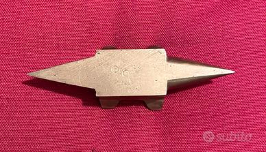 Vintage - piccola incudine in ottone (tipicamente usata per modellare piccoli fili e piastre di metallo, in orificeria) - può essere utilizzata come fermacarte - oggetto da collezione - misure: lunghezza totale cm 11, altezza (copresi i piedini) cm 3 - misure del rettangolo (poggio lavoro) cm 4 x cm 2,3 - peso gr 268