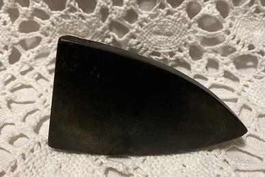 Conserva la sua patina nera naturale, segno dell’uso sul fuoco e dei molti anni trascorsi accanto alla stufa a legna o sulla piastra calda di cucine economiche, quando lo si scaldava e si stirava finché il calore rimaneva nella piastra.