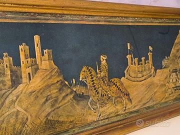 Elegante pannello in legno, decorato con cornice dorata, con riproduzione litografica di Guidoriccio da Fogliano, artista italiano del Novecento, noto per le sue opere ispirate alla pittura medievale e rinascimentale.