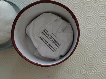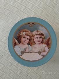 Vintage scatola retrò da collezione oppure esposizione. Contenitore: scatola rotonda con coperchio decorativo che ritrae 2 cherubini/angioletti; il design richiama lo stile classico. All'interno è presente un piumino bianco (detto "houpette") con fiocco centrale, usato per applicare il talco cosmetico sul viso/corpo. La scatola è integra e non è mai stata usata. Vendita finale. Contattare solo se veramente interessati. Disponibile consegna a mano a: Vercelli, Torino e Novara
